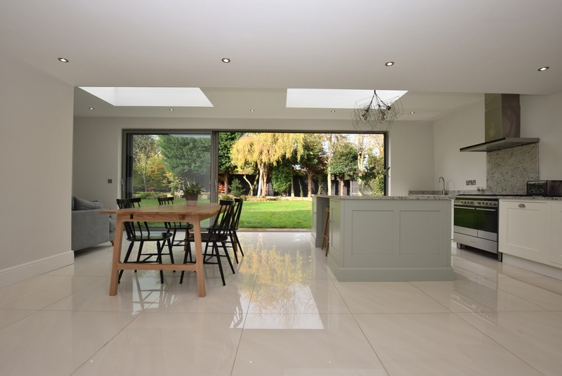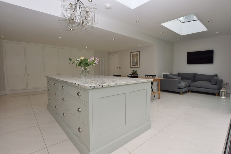The client here wanted to open up the back of the house and make the kitchen/dining area the main focal point. By installing large glazed sliding doors, and a large island it really is a great family kitchen and entertaining space for when friends and family come round.
